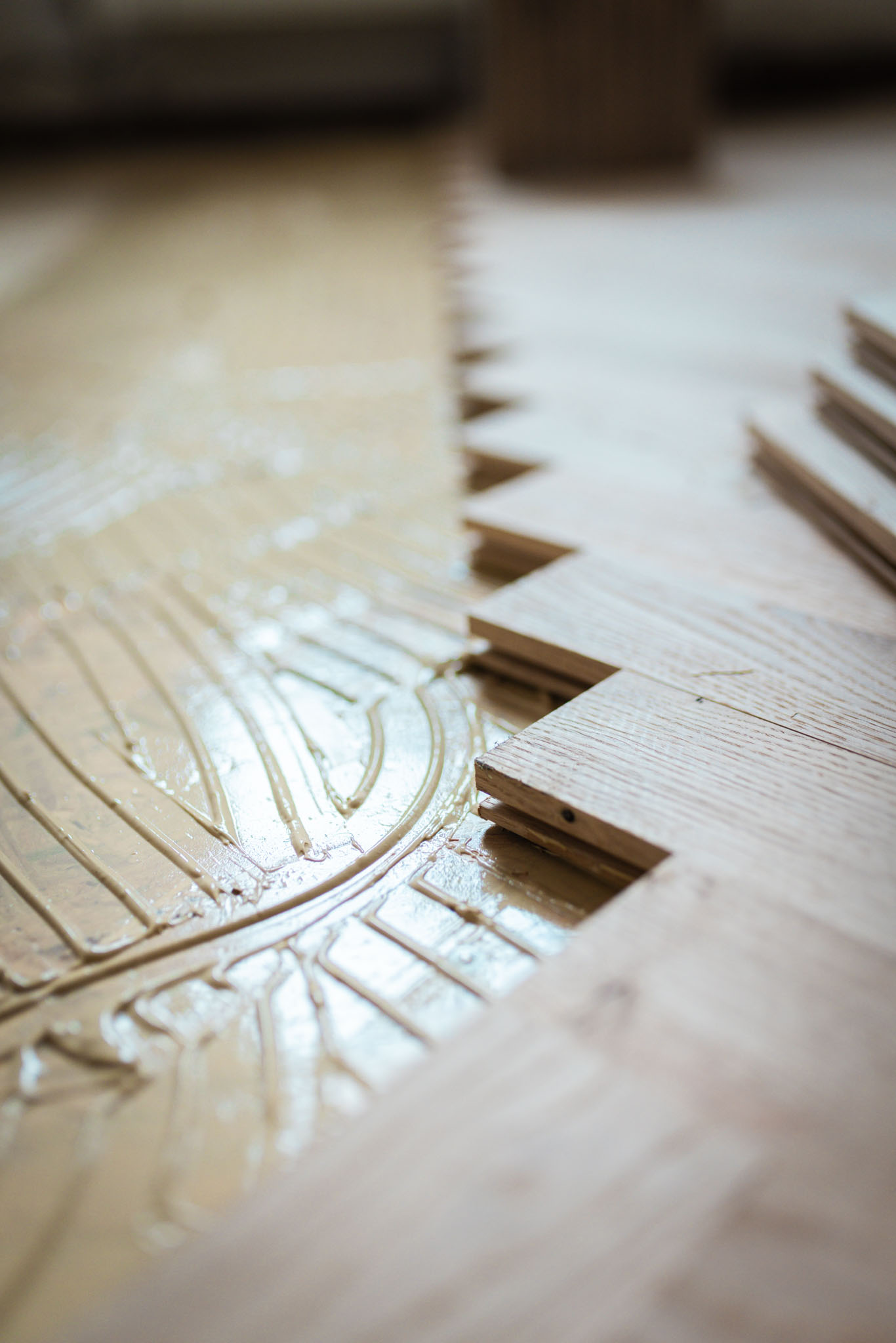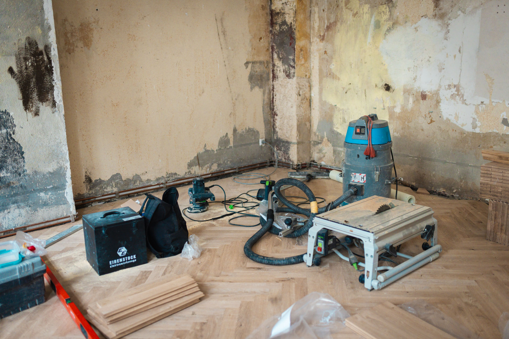 Nachdem wir Laminat, Teppich, Spanplatten, Dielung, Schüttung und die betroffenen Decken zurückgebaut haben, begann die eigentliche Verwandlung: