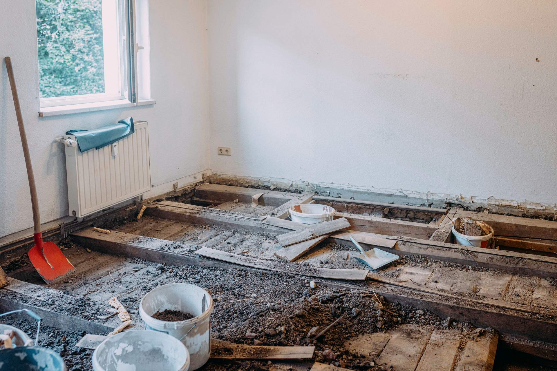Also: Laminat raus, Teppich raus, Spanplatten weg, Dielung demontiert und die darunterliegende Schüttung entfernt, die natürlich ebenfalls völlig nass war.